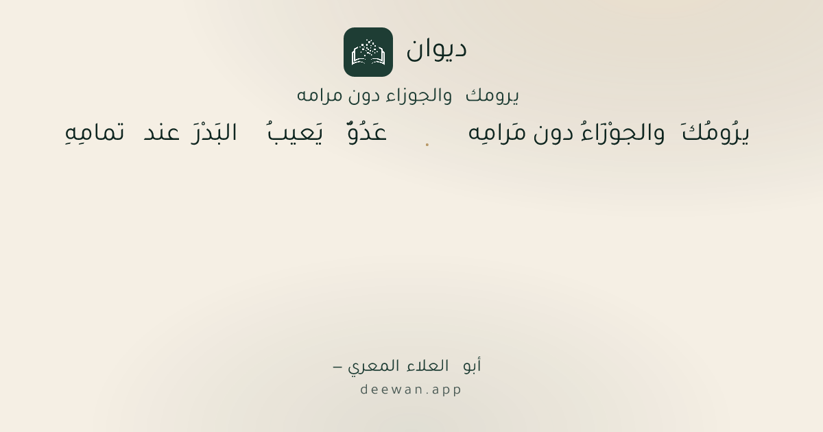 - 1يرُومُكَ والجوْزَاءُ دون مَرامِه◆عَدُوٌّ يَعيبُ البَدْرَ عند تمامِهِ