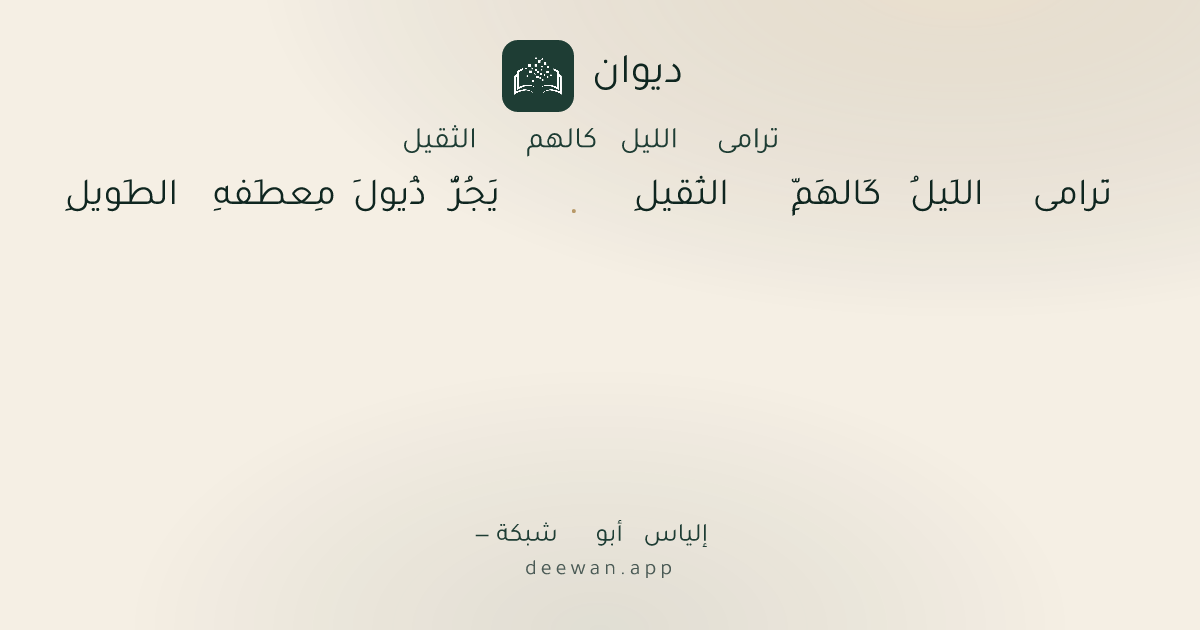 - 1تَرامى اللَيلُ كَالهَمِّ الثَقيلِ◆يَجُرُّ ذُيولَ مِعطَفهِ الطَويلِ