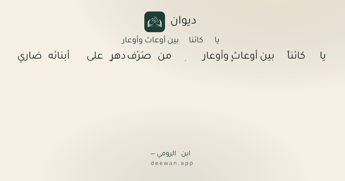 - 1يا كائناً بين أوعاثٍ وأوعارِ◆من صَرْف دهرٍ على أبنائه ضاري