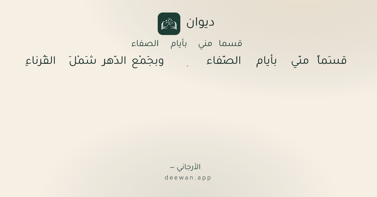 - 1قسَماً منّي بأيام الصَّفاء◆وبجَمْع الدّهرِ شَمْلَ القُرناءِ