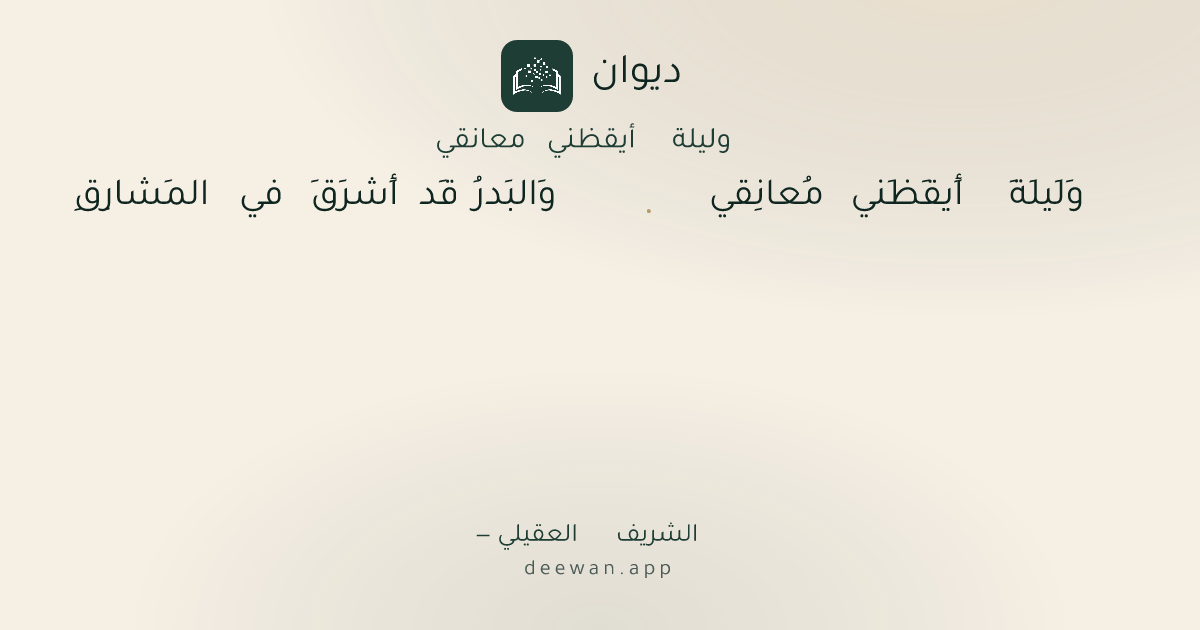 - 1وَلَيلَةَ أَيقَظَني مُعانِقي◆وَالبَدرُ قَد أَشرَقَ في المَشارِقِ