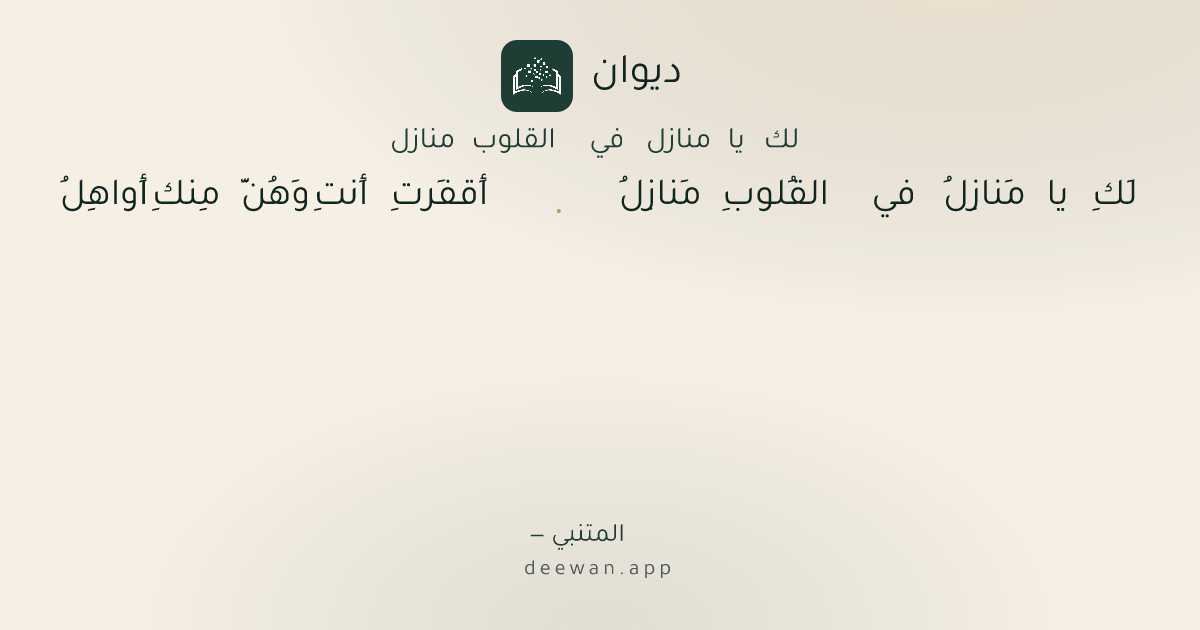 - 1لَكِ يا مَنازِلُ في القُلوبِ مَنازِلُ◆أَقفَرتِ أَنتِ وَهُنَّ مِنكِ أَواهِلُ