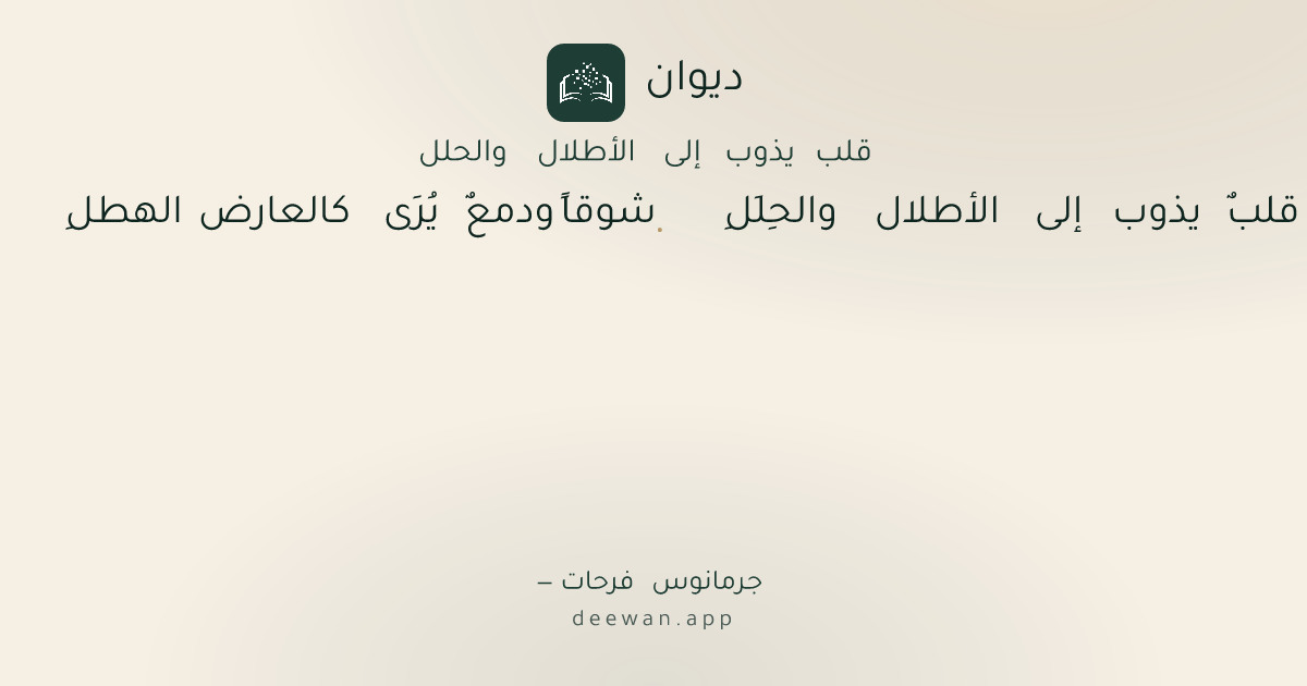 - 1قلبٌ يذوب إلى الأطلال والحِلَلِ◆شوقاً ودمعٌ يُرَى كالعارض الهطلِ