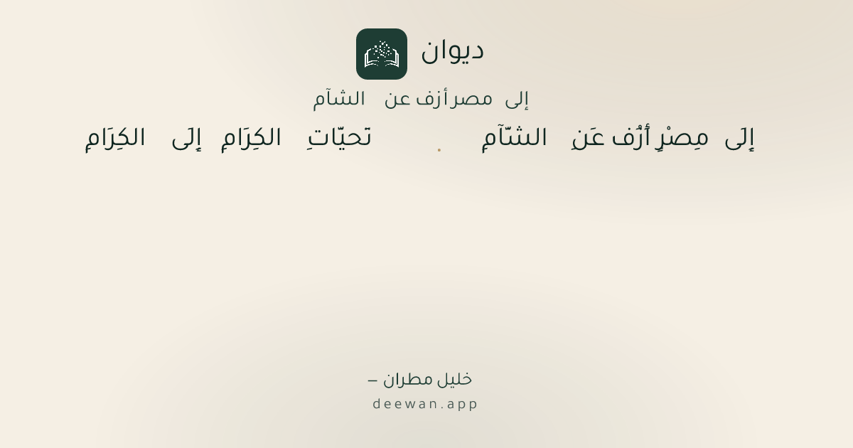 - 1إِلَى مِصْرٍ أَزُف عَنِ الشَّآمِ◆تَحيَّاتِ الكِرَامِ إِلَى الكِرَامِ