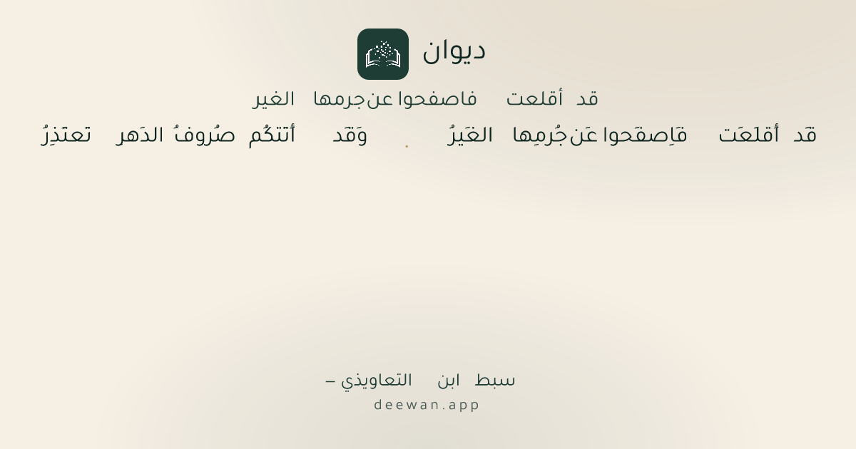 - 1قَد أَقلَعَت فَاِصفَحوا عَن جُرمِها الغَيرُ◆وَقَد أَتَتكُم صُروفُ الدَهرِ تَعتَذِرُ