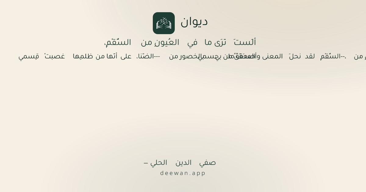 - 1ألَستَ تَرَى ما في العُيونِ من السُّقْمِ--، لقد نحلَ المعنى المدفَّقُ من جسمي◆وأضعَفُ ما بي بالخصورِ من الضّنا،--- على أنّها من ظلمِها غصبتْ قِسمي