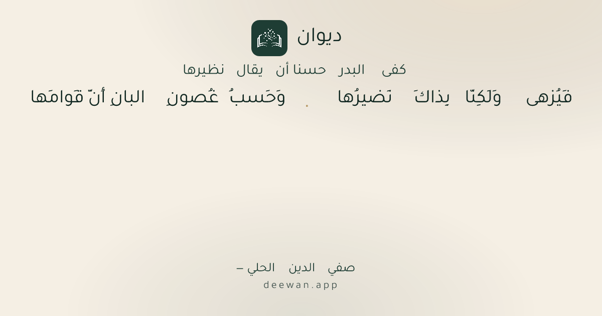 - 1فَيُزهى وَلَكِنّا بِذاكَ نَضيرُها◆وَحَسبُ غُصونِ البانِ أَنَّ قَوامَها