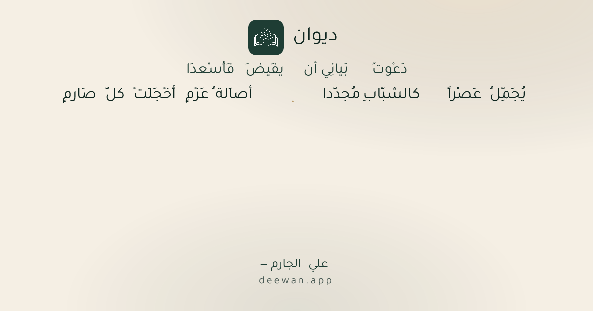 - 1يُجَمِّلُ عَصْراً كالشبَّابِ مُجدَّدا◆أصاَلة ُ عَزْمٍ أَخْجَلَتْ كلَّ صَارِمٍ