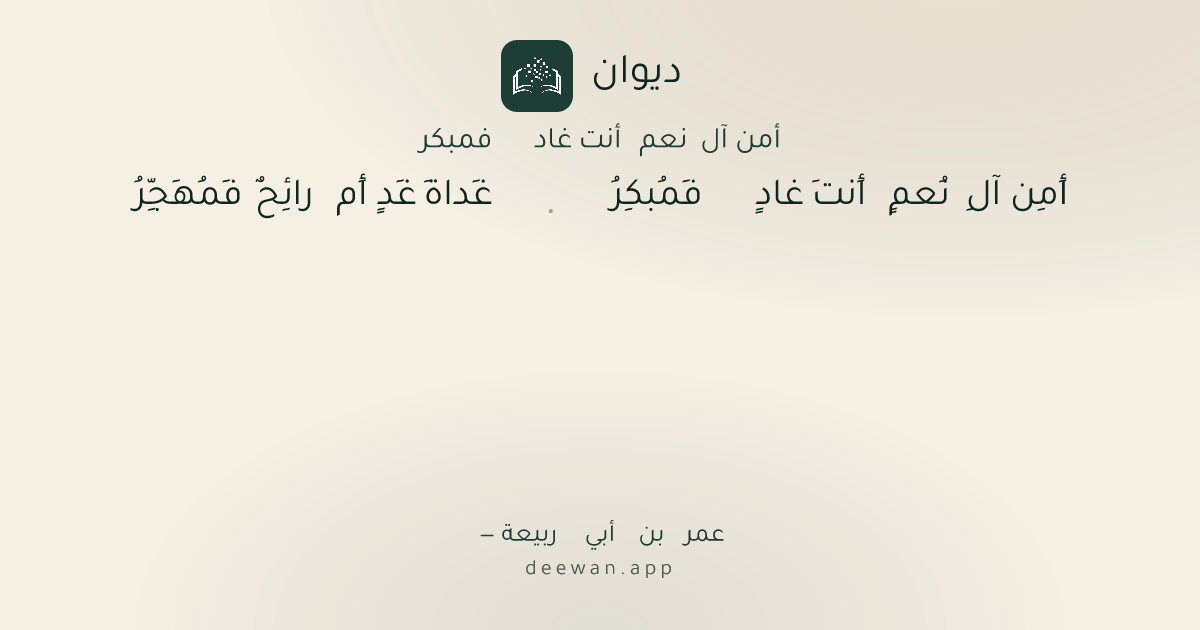 - 1أَمِن آلِ نُعمٍ أَنتَ غادٍ فَمُبكِرُ◆غَداةَ غَدٍ أَم رائِحٌ فَمُهَجِّرُ