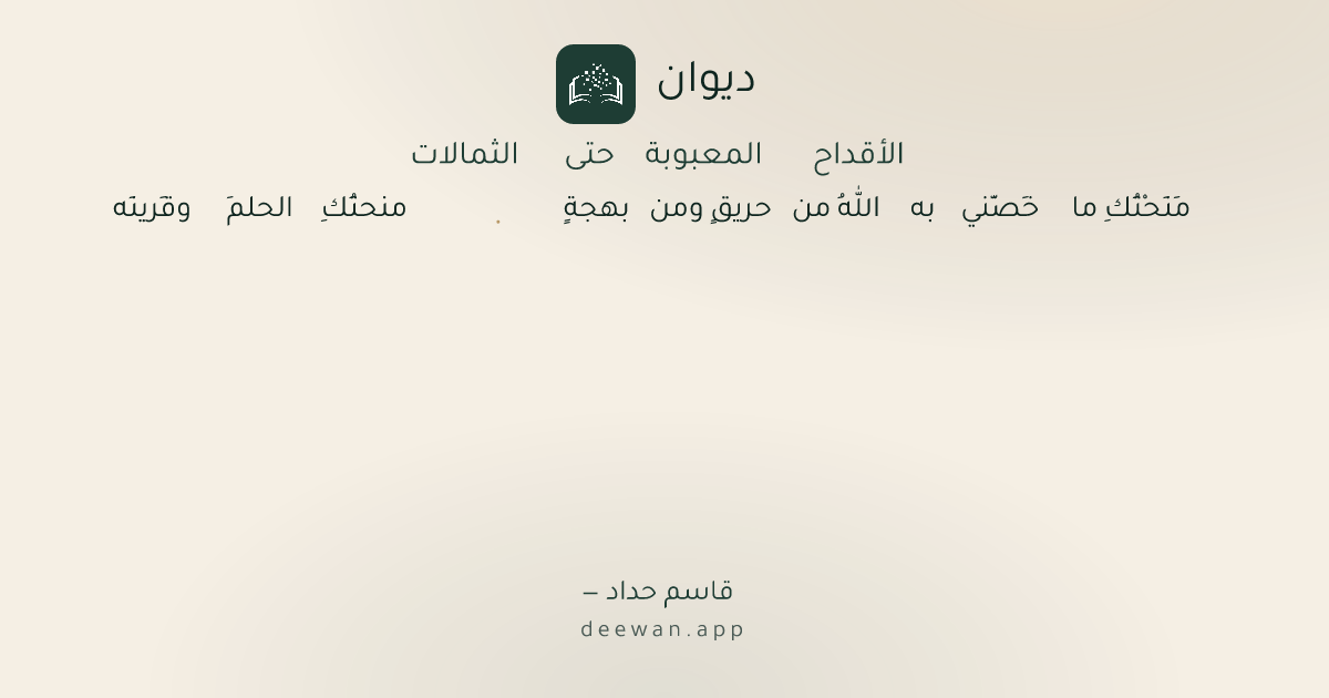 - 1مَنَحْتُكِ ما خَصَّني به اللهُ من حريقٍ ومن بهجةٍ◆منحتُكِ الحلمَ وقَرينَه