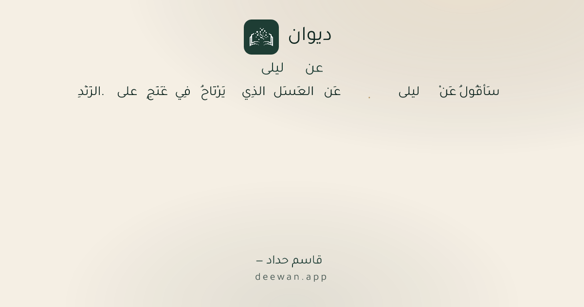 - 1سَأقُولُ عَنْ ليلى◆عَن العَسَل الذِي يَرْتَاحُ فِي غَنَجٍ على الزَنْدِ.