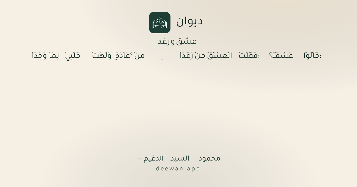 - 1قَاْلُوْا: عَشِقْتَ؟ فَقُلْتُ: الْعِشْقُ مِنْ رَغَدَاْ◆مِنْ غَاْدَةٍº وَلَّهَتْ قَلْبِيْ بِمَاْ وَجَدَاْ