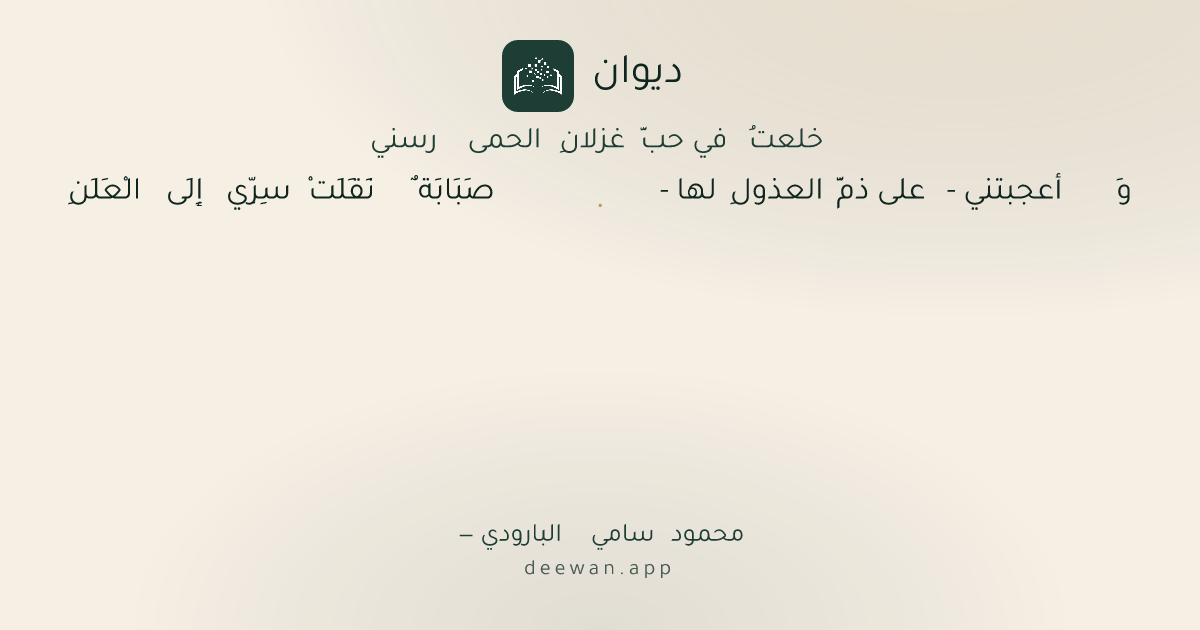 - 1وَ أعجبتني - على ذمَّ العذولِ لها -◆صَبَابَة ٌ نَقَلَتْ سِرِّي إِلَى الْعَلَنِ