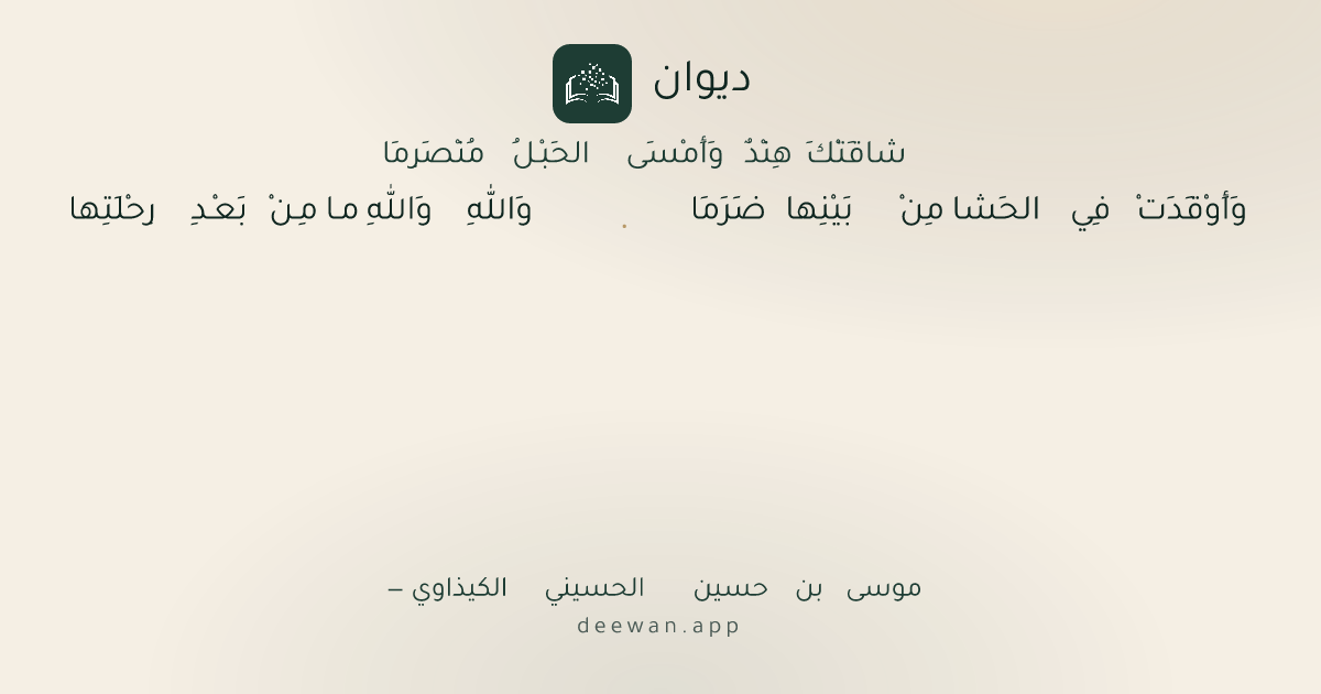 - 1وَأَوْقَدَتْ فِي الحَشا مِنْ بَيْنِها ضَرَمَا◆وَاللهِ وَاللهِ مـا مِـنْ بَعْـدِ رِحْلَتِها