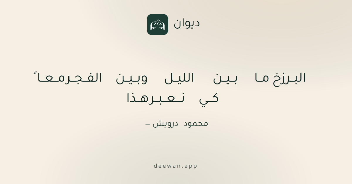 العصر الحديثكـــي نـــعــبــر هــذا البــرزخ مــا بــيــن الليــل وبــيــن الفــجــر مــعــا ًمحمود درويشashaarحفظ كصورةالبحر شعر التفعيلة