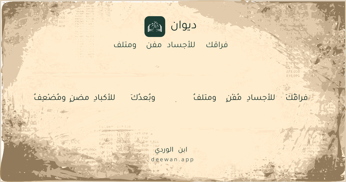 - 1فراقُكَ للأجسادِ مُفْنٍ ومتلفُ◆وبُعدُكَ للأكبادِ مضنٍ ومُضْعِفُ