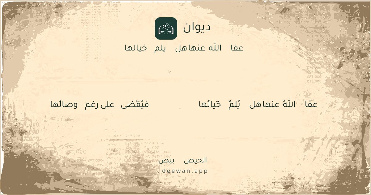 - 1عفا اللهُ عنها هل يُلمُّ خَيالُها◆فيُقْضى على رغم وصالُها