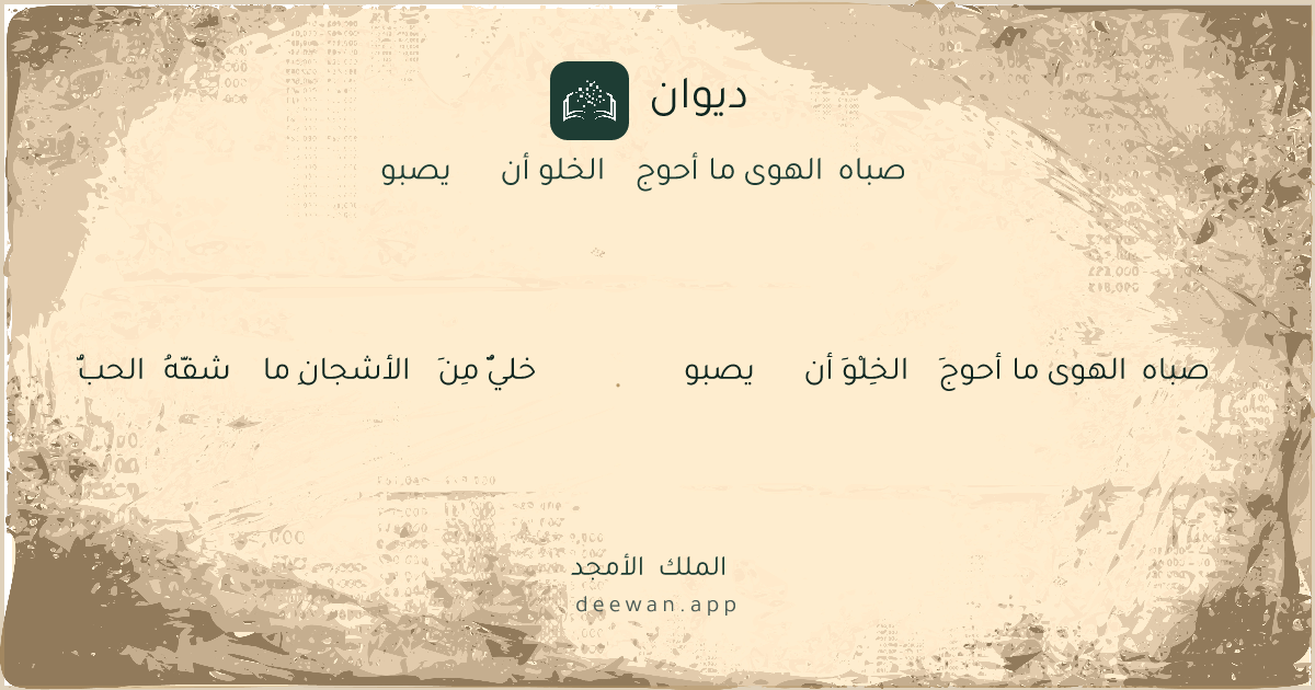 - 1صباه الهوى ما أحوجَ الخِلْوَ أن يصبو◆خليٌّ مِنَ الأشجانِ ما شفَّهُ الحبُّ