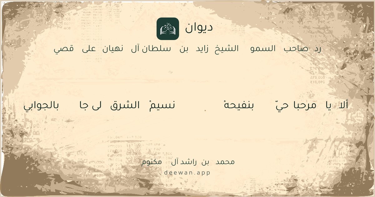 - 1ألا يا مرحبا حيّ بنفيحهْ◆نسيمْ الشرق لى جا بالجوابي